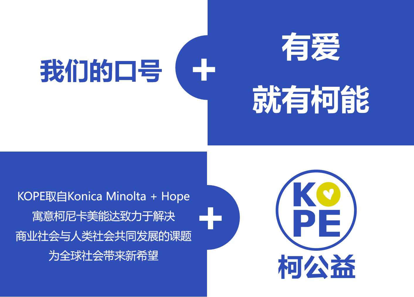 2018年,柯尼卡美能達推出了全新的集團公益品牌——“KOPE?柯公益”,并確立了“有愛,就有柯能”的公益口號,力求以更為積極的姿態聚力環保和教育領域的企業社會責任活動,致力于通過常態化、廣泛性地在中國開展各項公益活動,創造可提升社會質量的價值,持之以恒、責無旁貸地為實現社會的可持續發展貢獻力量!