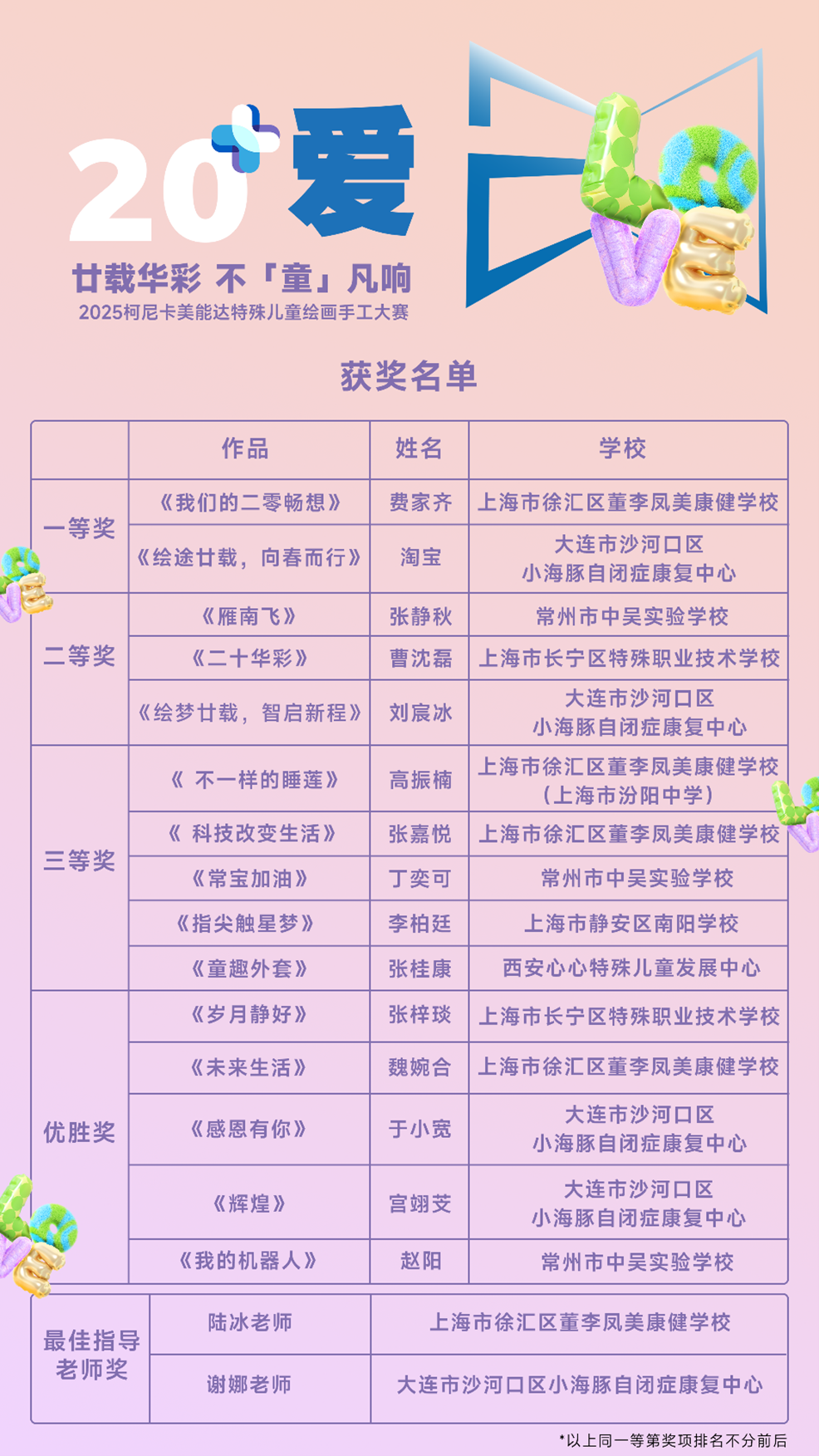 本屆大賽以「廿載華彩 不“童”凡響」為主題,吸引了全國7座城市、11所特殊學校的孩子們踴躍參與。62幅充滿真摯表達的繪畫與手工作品,不僅展現了孩子們非凡的想象力,更完成了一場藝術與心靈的對話。經由4萬余名公眾的線上投票及最終評審,15幅優秀作品最終斬獲殊榮。