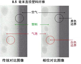 顯而易見,相位對比圖像擁有著比傳統X線圖像更為優越的清晰度(圖4)。塑料與空氣的邊界顯示為一條黑線,而管內氣泡的邊緣為清晰明朗的白色(邊緣銳利)。