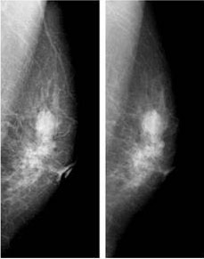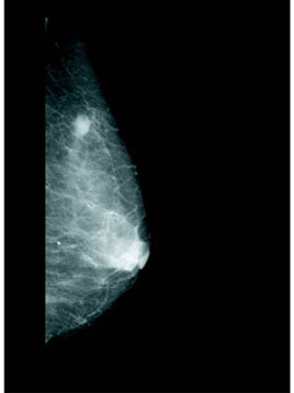 醫生不僅要仔細檢查圖像上方的白色塊狀陰影(圖6),還要查究直徑僅為幾百微米的白色微斑(微小鈣化),并且要注意它們的形狀。這種微小鈣化極為重要,被認為是乳腺癌(原發性乳腺癌)的征兆。