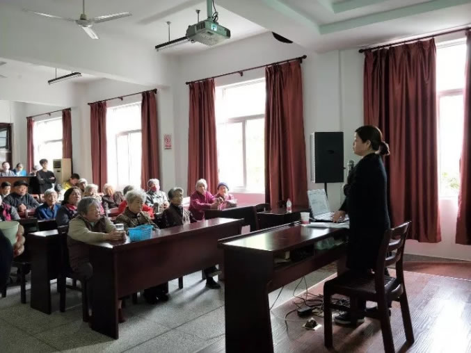 市場部產品經理鐘穎為福利院老人分享“高血壓的預防和保健”知識
