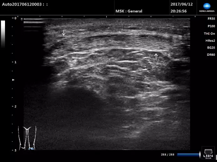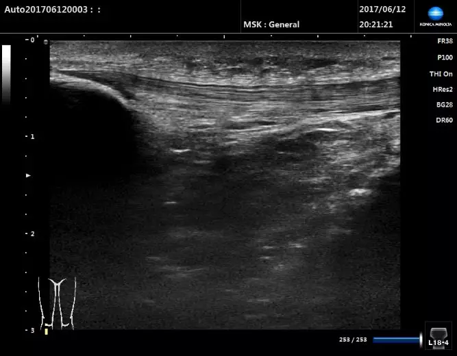 探頭放置在髕骨下方,矢狀切面顯示成纖維狀高回聲的髕腱。
