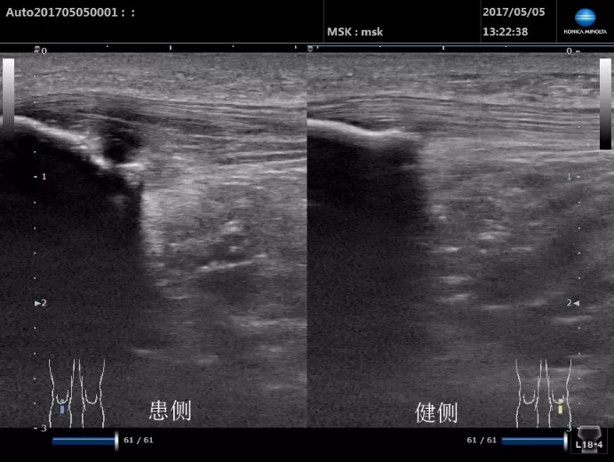 盡管長軸切面為檢查髕腱的主要檢查切面,但有時髕腱的局灶性病變并不位于髕腱的中線位置。所以我們還應進行短軸切面掃查以避免髕腱邊緣病變的漏掃。