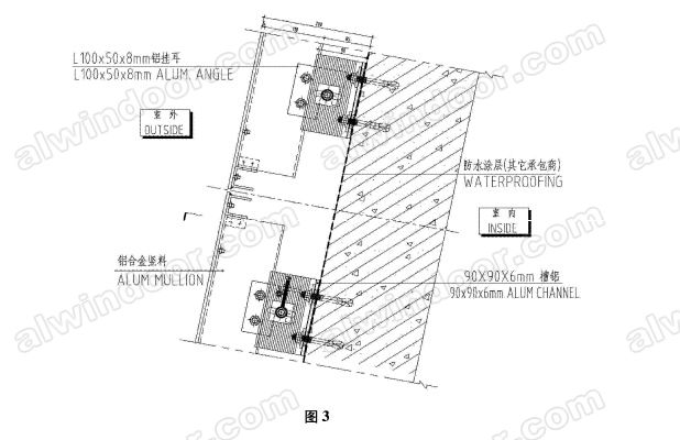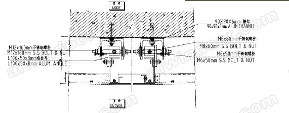 其次,是鋁板接縫的設(shè)計(jì)。鋁板幕墻接縫采用開放式的節(jié)點(diǎn)設(shè)計(jì),不需要打膠。幕墻不需要做防水設(shè)計(jì),采用土建結(jié)構(gòu)防水。大刁、斜圓錐臺(tái)采用混凝土結(jié)構(gòu),在結(jié)構(gòu)上面先徐上防水涂層,采用90x90x6槽鋁墊上2mm的EPDM橡膠墊片,通過膨脹螺栓固定在結(jié)構(gòu)上作為固定支座。鋁板用90X90X6槽鋁支座來固定,不需要橫梁和立柱(如圖3):鋁單板左右邊各用種焊釘固定一根鋁型材豎料,在豎料的上下兩端各通過2個(gè)螺栓固定一個(gè)L100x50xgmm鋁掛耳,將鋁掛耳掛裝在槽鋁支座中間的M12x160不銹鋼螺桿上,這樣就將鋁板掛裝在結(jié)構(gòu)外面。裝在槽鋁支座側(cè)面上的M6X50mm的螺栓可以在水平方向左右調(diào)整鋁板,并起到限位的作用;裝在鋁板上端鋁掛耳的MSx60螺栓可以在高度方向調(diào)整鋁板;槽鋁支座上安裝螺桿的孔位在鋁板進(jìn)出方向開甲17X56的長(zhǎng)條孔來調(diào)整鋁板進(jìn)出的距離,從而可以實(shí)現(xiàn)連接節(jié)點(diǎn)的三維位置可調(diào)。