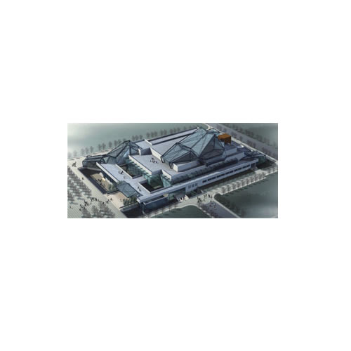 本工程最大的特點是大型的鋼框架體系外支撐于南、北立面的單層索網玻璃幕墻。玻璃幕墻的單根拉索固定于兩端鋼結構上,該鋼結構體系總寬度69.45m,總高度73.925m,最大箱型柱斷面尺寸達到800x800x80。南北兩側鋼結構上部用兩個三角桁架梁聯系在一起。鋼結構體系立體圖,如下圖2.1所示;其單索跨度分別為寬40.2m,高度為63.975m。玻璃選用12+1.52SGP+10鋼化夾膠玻璃(詞條“鋼化夾膠玻璃”由行業大百科提供),分格多數為2500mm(寬)×1400mm(高),通過不銹鋼(詞條“不銹鋼”由行業大百科提供)夾板固定于不銹鋼拉索上,橫向拉索和豎向拉索均采用φ60不銹鋼拉索(詳見圖2.1和2.2)。