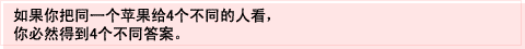 顏色是一種有關感覺和主觀解釋的問題。 即使他們看著同一物體(在這里是說一個蘋果),人們將依不同的標準和經歷以迥然不同的字眼來表達同一種顏色。