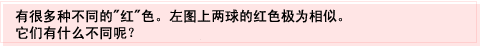 色彩和光的知識 左圖上有兩個紅球。 乍一看,它們都是一樣的紅色,但仔細觀察一下你就會發現它們在好幾方面都是不一樣的。 兩球都是紅色,但上球的顏色較為明亮,下球則較暗。 還有,上球的顏色顯得鮮艷。 可見,即使兩球看起來都是紅的,但它們的顏色卻是不一樣的。 當將顏色分類時,它們可以以構成顏色的三個屬性來表示,即:色調、亮度和色飽和度(鮮艷度)。 3/13