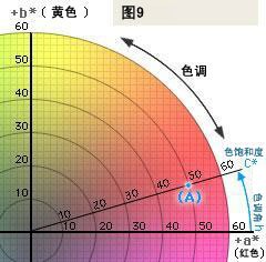 L*C*h色空間使用與L*a*b*色空間一樣的色度圖,但是它使用柱面坐標而不是直角坐標。 在該色空間中,L*代表亮度且與L*a*b*色空間中的L*相同,C*為色飽和度,h為色調角。 在圓心處色飽和度C*的值為0,離圓心越遠C*值越大。 色調角被規定為從+a*軸開始并以度數表示: 0為+a*(紅),90為+b*(黃),180為-a*(綠),270為-b*(藍)。 如果我們用L*C*h色空間來測量蘋果的顏色,我們將得到下列結果。 如果我們把這些值描繪在圖9上,我們就得到點(A)。