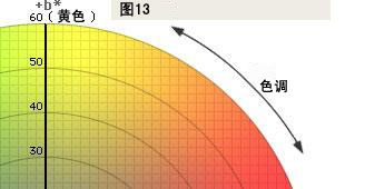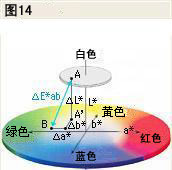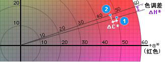 在L*a*b*色空間中,色差可以表示為一個單一數值?E*ab,它表示了色差的大小但是并沒有說明到底有何不同。 ?E*ab由下列方程式確定: 如果我們把上面顯示器 ?H*=[(?E*ab)2 - (?L*)2 - (?C*)2]1/2所確定),為+1.92,如果我們查看一下圖13,則它意味著蘋果 如果我們用文字來描述色差,盡管用文字不如用數字來得精確。 圖15表示某些用來描述亮度差和色飽和度差的術語;在該圖上表示的術語指出色差的方向,但如果未附帶使用修飾詞(稍微、十分等),就不指明色差的程度。 從圖上所標出的兩個蘋果的值,我們就可以說蘋果