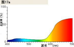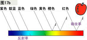 如果我們測量一個蘋果,我們得到如圖17a所示的光譜曲線圖。 在曲線圖上我們可以看到在紅色波長區(qū)內(nèi)反射比(反射光的量)高,但在其他波長區(qū)反射比(反射光的量)低。 圖17b表示蘋果反射橙色和紅色波長區(qū)的光,同時吸收綠、藍(lán)、靛藍(lán)、紫色波長區(qū)的光。 因此,用分光測色計進(jìn)行測量,并把結(jié)果顯示在光譜曲線圖上,我們就能看到蘋果顏色的性質(zhì)。