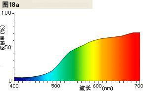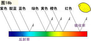如果我們測量一個檸檬,我們可以得到如圖18a所示的光譜曲線圖。 在該圖上我們可以看到,在紅色和黃色波長區(qū)內(nèi)反射比(反射光的量)高,但在靛藍(lán)和紫色波長區(qū)內(nèi)反射比(反射光的量)低。 圖18b表示檸檬反射綠,黃和紅色波長區(qū)的光,同時吸收靛藍(lán)和紫色波長區(qū)的光。 這就是檸檬顏色的性質(zhì)。 如此高的準(zhǔn)確性,人眼或甚至在第I部分中討論過的色彩色差計是不可能達(dá)到的;而只有分光測色計才能達(dá)到。