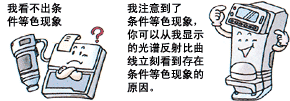 在前面一節里我們討論了一物體的顏色為什么隨所受照明的光線而不同。 一個與之有關的問題是:例如,兩物體在日光下的顏色顯得是一樣的,但是在室內燈光照明之下卻顯得有差別。 這種兩種顏色在一種光源之下顯示相同,但在另一種光源之下顯出不同的現象,稱為條件等色現象。 對于有條件等色現象的物體,兩物體顏色的光譜反射特性是不一樣的,但是在某一種光源照射之下產生的三刺激值是一樣的,而在另一種光源照射之下則互顯差異。 這一問題常常是由于使用不同的顏料或材料所形成的。