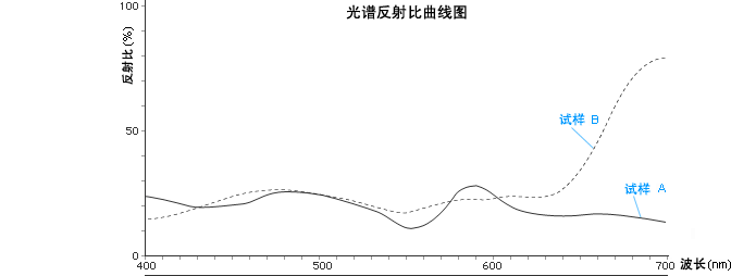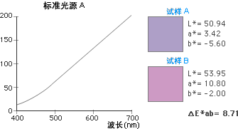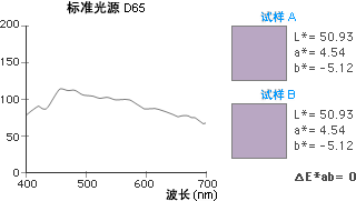 *值卻是一樣的,但在標準光源A之下這兩個值卻又是不一樣的。 這說明盡管兩件試樣的光譜反射特性不一樣,但是在日光(標準光源
