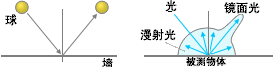 當(dāng)彈性小球被投向墻面并反彈回來時(shí),其角度是一樣的。 同樣道理,由于光源照射產(chǎn)生從相同角度不同方向反射回來的光線,我們稱為鏡面反射光, 因?yàn)楣饩€就像是被鏡子反射回來的一樣。 那些不是由于鏡面反射而是向各個(gè)方向散射的光線,我們稱之為漫射光。 鏡面反射光與漫射光的和就是我們說的反射光。