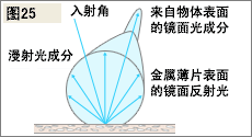 為了達到色彩絢麗的效果,許多涂料特別是汽車用方面涂料都使用了染色劑與金屬粒薄片相混合的方法。 在金屬漆中,由于金屬薄片的作用,光線會向各個方向反射,雖然它們一般來說都是同方向線性排列的。 圖25中表明了在金屬漆中鏡面反射光與漫射光是如何相互作用的。 由于有金屬薄片引起的不同方向的鏡面反射光的作用,使人眼看到的物體顏色也有所不同。 在一個接近金屬片作用下的鏡面反射光的角度觀察時,我們會看到高亮度的顏色。 在一個金屬薄片未影響的角度下,我們則看到了較暗的顏色。 總之,用分光測色計測量金屬色時,在多角度下測量取值是很有必要和有效的。