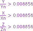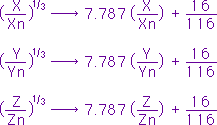 X, Y, Z: 試樣的三刺激值XYZ(對2º標(biāo)準(zhǔn)觀察者)或 Xn, Yn, Zn: 全反射漫射體的三刺激值XYZ(對2º標(biāo)準(zhǔn)觀察者)或 如果X/Xn, Y/Yn, 或Z/Zn小于 0.008856,上列公式應(yīng)按下述作變更: