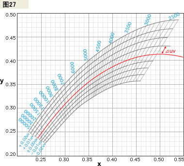 圖27中表示出了黑體軌跡線,等溫線和與黑體軌跡線相差?uv的等值曲線。如,一個發光源與色溫為7000k的黑體在綠色方向上有0.01的色差(?Euv),就可以表示為相關色溫為7000k+0.01(uv單位)。