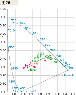 當一個物體溫度升高時,其熱輻射能也會增加。 與此同時,物體的顏色會經歷一個從紅到黃再到白的變化過程。 物理學中,就把黑體定義為一個理想物體,它吸收所有能量并全部以熱輻射的方式釋放出來。 這樣黑體的溫度與其輻射的能量的顏色就有了直接的聯系。 黑體的絕對溫度就被用來表示當前的色溫值。 這樣顏色就落在理想的黑體軌跡上,如圖26x,y色度圖所示。