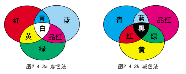 圖2.4.3a顯示了混合紅、綠、藍三種色彩后的視覺效果。 紅、綠、藍稱為三原色,青、品紅、黃稱為三間色(三補色)。