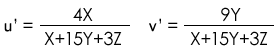 均勻色度等級(jí)(Uniform Chromaticity Scale)的出現(xiàn)彌補(bǔ)了1931系統(tǒng)的缺點(diǎn)。 它嘗試提供一種在大致相同的亮度下,人的感知更統(tǒng)一、更均勻的色空間。 1976 CIE UCS色度圖使用u’和v’, 這兩個(gè)符號(hào)的使用,是為了與相類似但存在時(shí)間短暫的1960 CIE-USC系統(tǒng)的u、v符號(hào)相區(qū)別。 u’和v’的值也是從XYZ三刺激值計(jì)算得到的,計(jì)算公式如下: