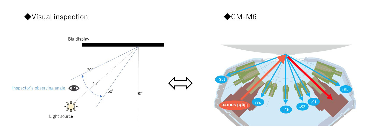 便攜式多角度分光色差儀CM-M6,配備了6個角度(-15°、15°、25°、45°、75°、110°)和雙光路系統,相比較同類型多角度分光測色計,在檢測金屬和珠光色彩方面擁有更高的精度。CM-M6擁有圍繞其中心軸對稱的雙重照明/受光系統。即使是在色度計輕微傾斜的情況下,此系統也可確保較高的測量穩定性,可穩定地測量半徑R=300的曲面。