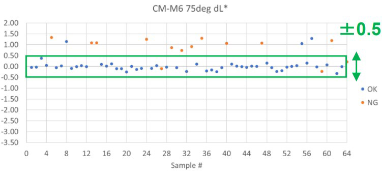 我們再來結合實驗中檢測員的目視數據,跟儀器采樣數據進行對比。其中,黃色標注為人眼目視判斷NG的LED模塊,而在CM-M6測定的64組數據中: