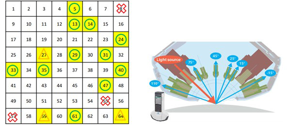 柯尼卡美能達多角度分光測色計CM-M6是一款照明角度為45°,觀察角分別為-15°、15°、25°、45°、75°、110°的便攜式測色儀器。我們嘗試以此來替代人眼目視,通過測色計對LED模組進行多點測量采樣,取每個單元模塊5點平均值,共采集64組數據進行比對,找出與人眼觀察匹配的有色差的LED模塊,從而提出使用儀器替代人眼目視判斷的可能性。