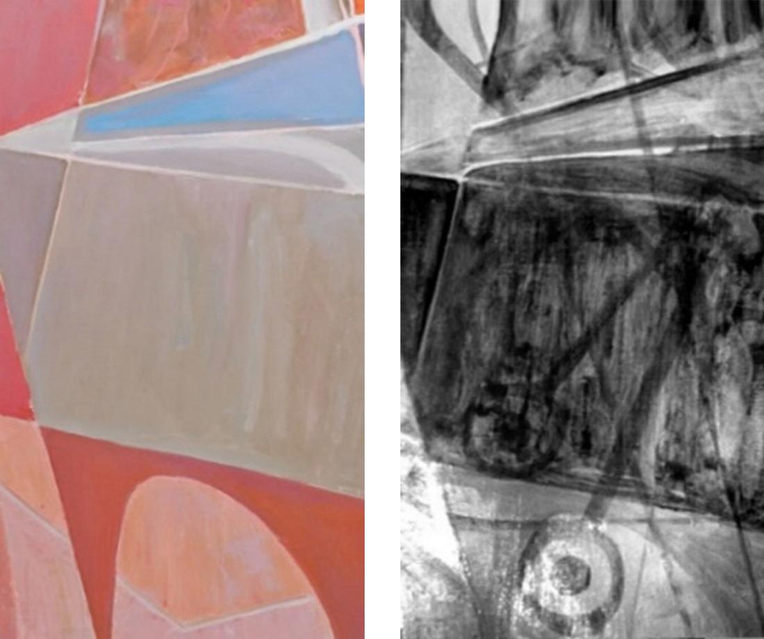 在可見光情形下不可見的圖像信息均可稱為隱含信息,其涵蓋范圍廣泛,包括輪廓信息、底稿信息、修補痕跡、擦除或污損筆跡和隱形損害信息等。根據隱含信息可以更深入的分析文物創作的藝術手法、內容的歷史軌跡和修復保護痕跡等,也可以用于文物的真假鑒定。隱含信息發掘充分利用了高光譜成像技術在文物研究中的優勢,其“圖譜合一”的影像數據能夠揭示單純光譜分析或數字影像分析不易察覺的信息。由于物體在不同波段時的光譜反射率不同,其各波段影像也不相同。影像中不同像元的光譜曲線以及不同波段的光譜影像均存在差異,通過對比分析可以揭示一些隱含信息。