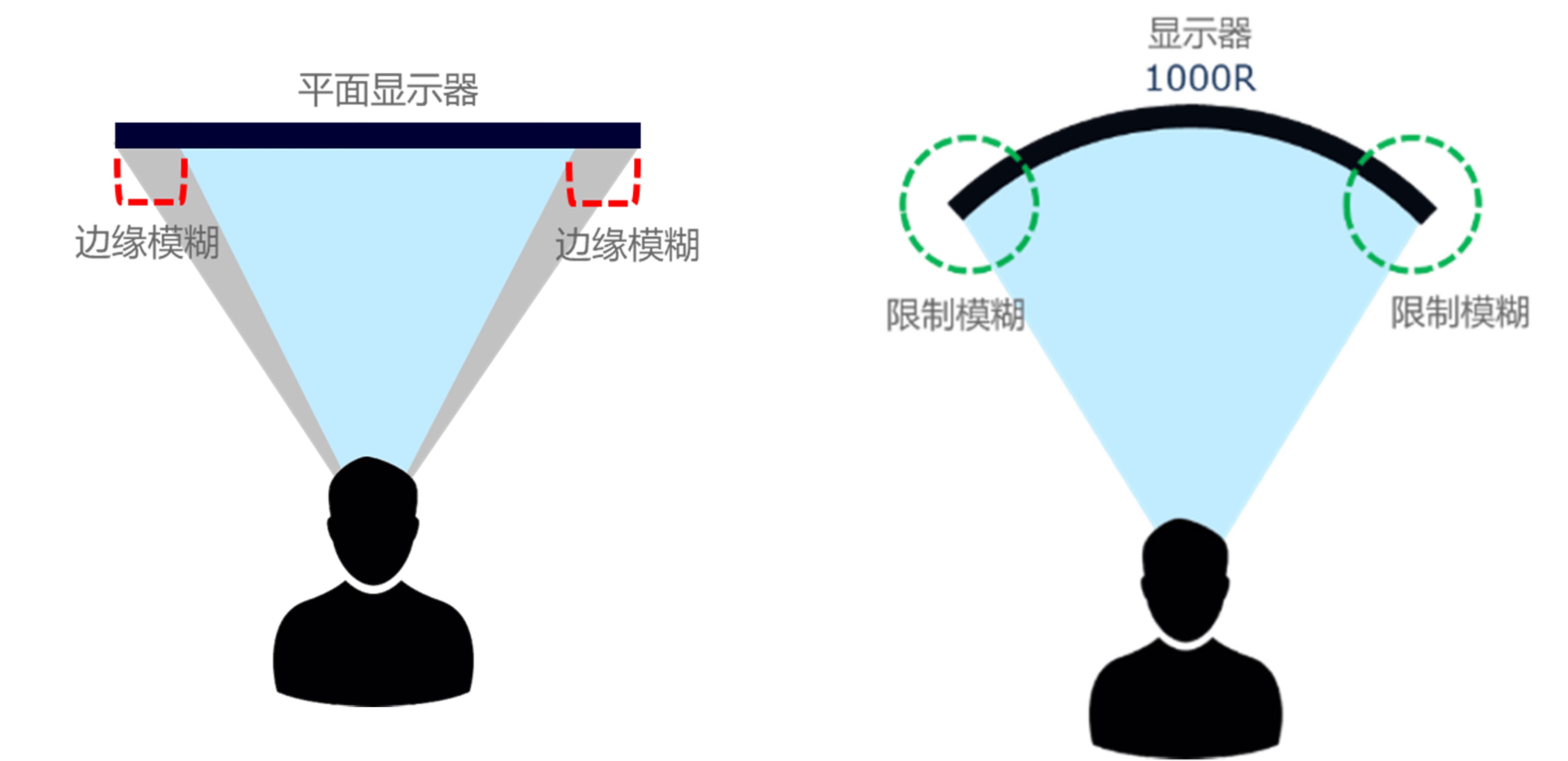 原先,在人眼觀看平面顯示的時(shí)候,由于平面顯示器和人類(lèi)邊緣視覺(jué)的曲率不匹配,可能會(huì)覺(jué)得顯示器的邊緣失真、模糊。在某些區(qū)域,視覺(jué)元素會(huì)變得模糊,需要轉(zhuǎn)動(dòng)眼睛才能清楚地看到這些區(qū)域。而具有水平曲率的顯示器不僅減少了顯示其邊緣的失真和模糊,還提高了對(duì)顯示器上所有視覺(jué)元素的沉浸感。