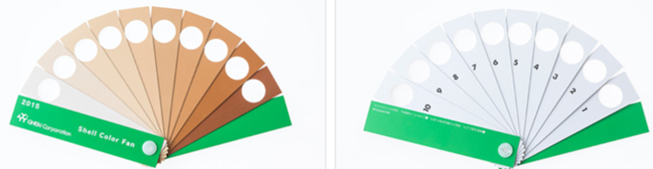 在使用方面,顏色圖卡應該以扇形展開,靠近蛋黃進行對比,且選擇視覺上最接近蛋黃的顏色。觀測照明應采用漫射自然光(非直射光),以免受到直接反射光的影響。另外,日本Ghen公司于1995年推出了第一款“貝殼彩扇”,用于對比和評價蛋殼的顏色。