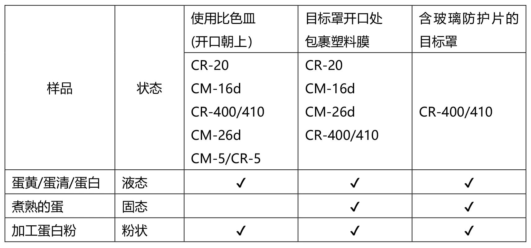 雞蛋加工前后的狀態非常多樣,包括蛋黃/蛋清/蛋白(液態)、煮熟的蛋(固態)、加工過的蛋白粉(粉狀)等。雖然測量方法上有一定的差異,但必須優先考慮到,污染會損壞測量儀器。