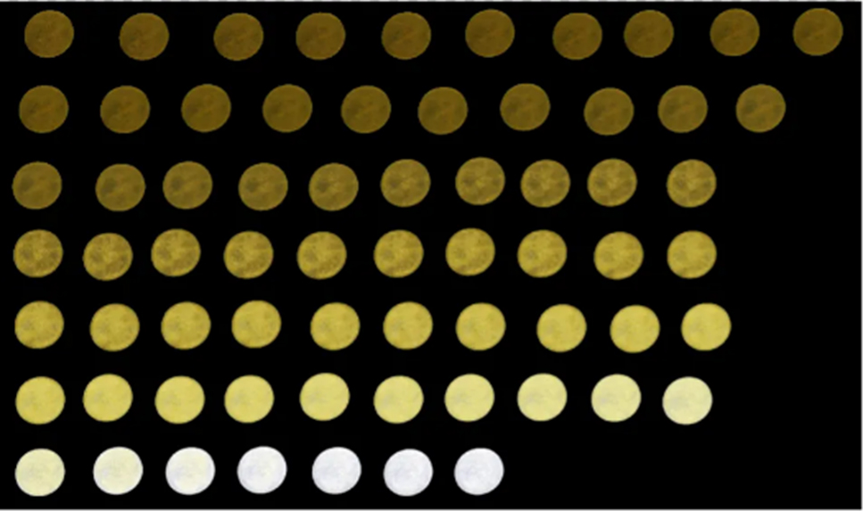 每幅圖像首先根據(jù)暗場和白場參考進行歸一化處理。隨后,將實驗過程中采集的全部67幅圖像合并為一個文件,形成拼接圖像。該圖像展現(xiàn)了棉片在不同干燥階段的狀態(tài),從右上角開始時非常濕潤,到右下角時已完全干燥。拼接圖像按行從左到右、從上到下排列。