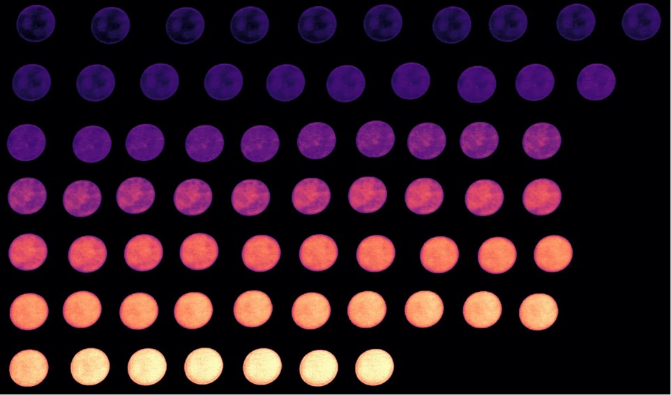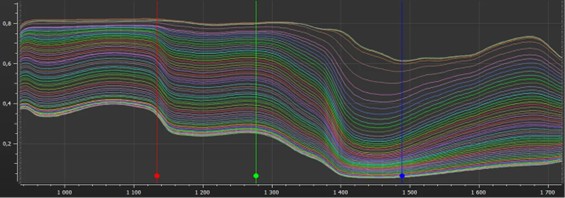 FX17高光譜相機對樣品的干燥過程進行了監(jiān)測,并每隔4分鐘進行一次測量,直至樣品完全干燥。整個過程共進行了67次測量,耗時264分鐘。而后我們使用SpecimINSIGHT軟件對數(shù)據(jù)進行了分析。