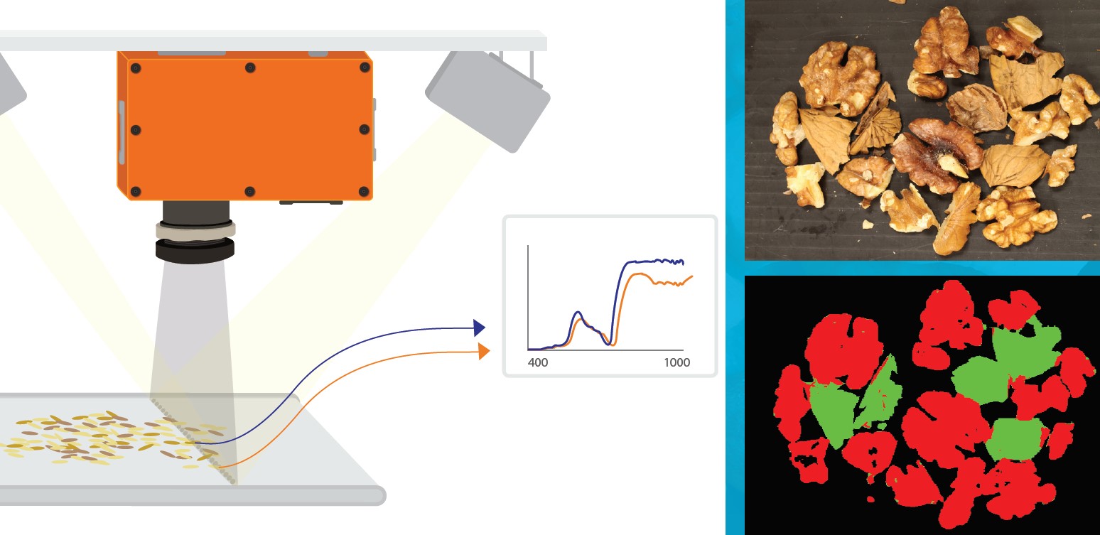 使用SPECIM高光譜相機有助于提高各種類型堅果的品質,如:杏仁、腰果、核桃、開心果、花生等。該相機可以在工業流水線速度下采集數百個波長的數據,并達到100%的檢測率,而不是只檢測某一個點。這些數據可用來檢測變色或霉變等情況,并幫助識別和去除外殼碎片、木頭或石頭、昆蟲等異物。