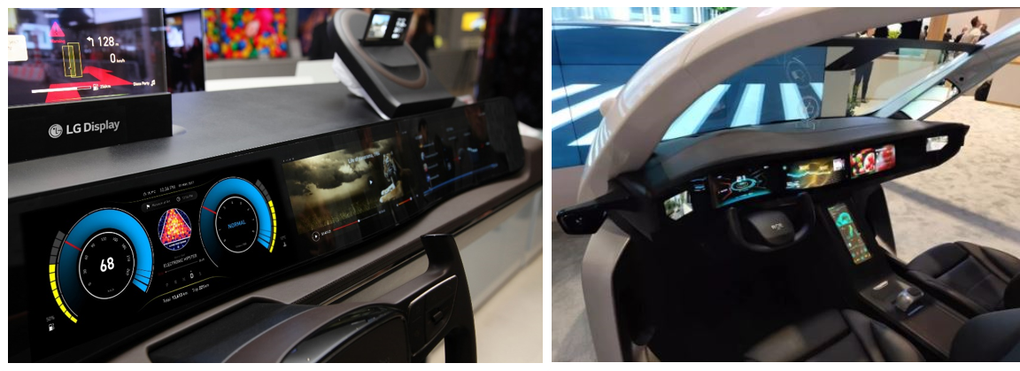 LG Display的塑料 OLED(POLED)汽車儀表板(左)和 BOE的“智能駕駛艙”(右)。圖片來源:分別來自LG Display和BOEVXEurope.com。