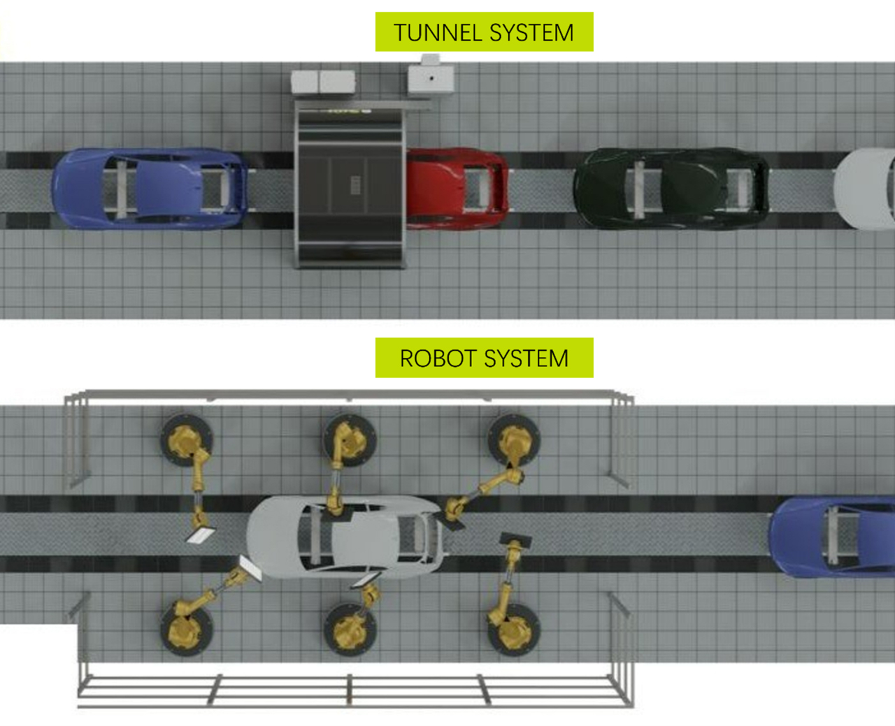 隧道能夠適應(yīng)所生產(chǎn)汽車的大小……只需在兩側(cè)留出一點(diǎn)額外空間來放置隧道。相比之下,機(jī)械臂(無論是靜態(tài)還是側(cè)向移動(dòng))都需要更多空間。通常,隧道所需空間不超過約25平方米。