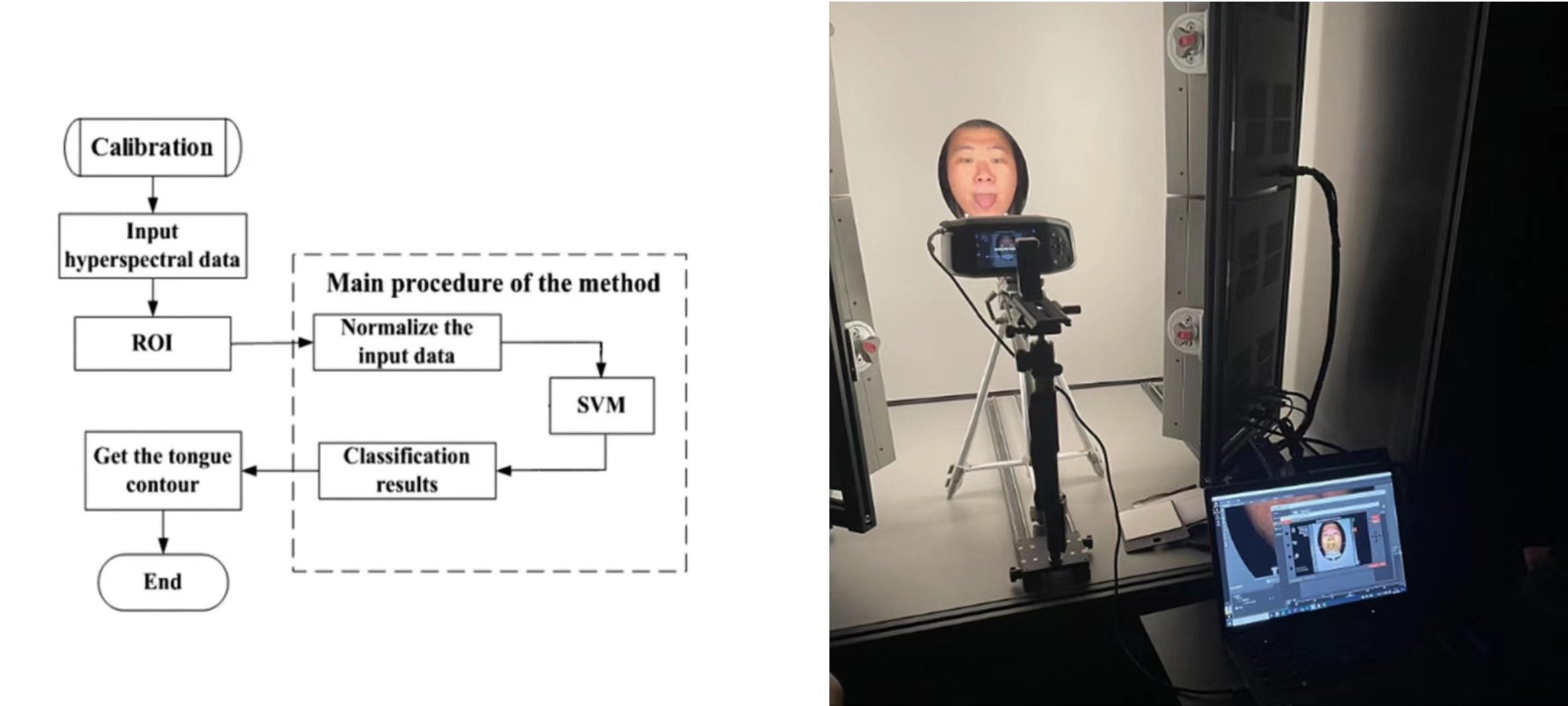 高光譜成像系統的流程舉例與舌苔檢測實際的系統搭建如圖所示: