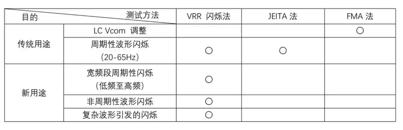 在可變刷新率(VRR)顯示屏中,需重點評估兩類特殊閃爍現象:第一,刷新率切換瞬間產生的臨時性非周期性閃爍,其次,顯示屏刷新具有復雜特性、以長時間離散間隔出現的非規律性閃爍。傳統閃爍測量主要采用對比度(FMA)法和專為LCD設計的JEITA標準方法,但這些方法無法準確測量VRR技術帶來的新型閃爍問題。