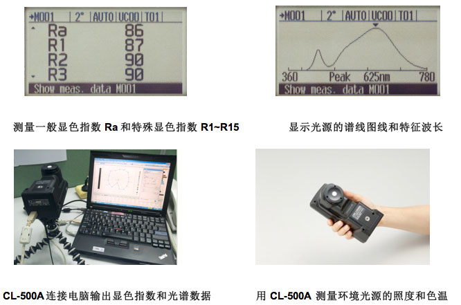 本實驗采用了柯尼卡美能達的分光輻射照度計CL-500A作為測量儀器,可以讀取光源的一般顯色指數Ra、特殊顯色指數R1~R15、色溫、照度、色坐標、光譜圖線、特征波長、色純度等參數。這臺分光輻射照度計在實驗前已通過國家計量院的計量,在照度和光譜數據方面均達到標準精度要求的誤差范圍。測量數據可在電腦軟件CL-S10w中分析和判斷,具體的測量功能如下:
