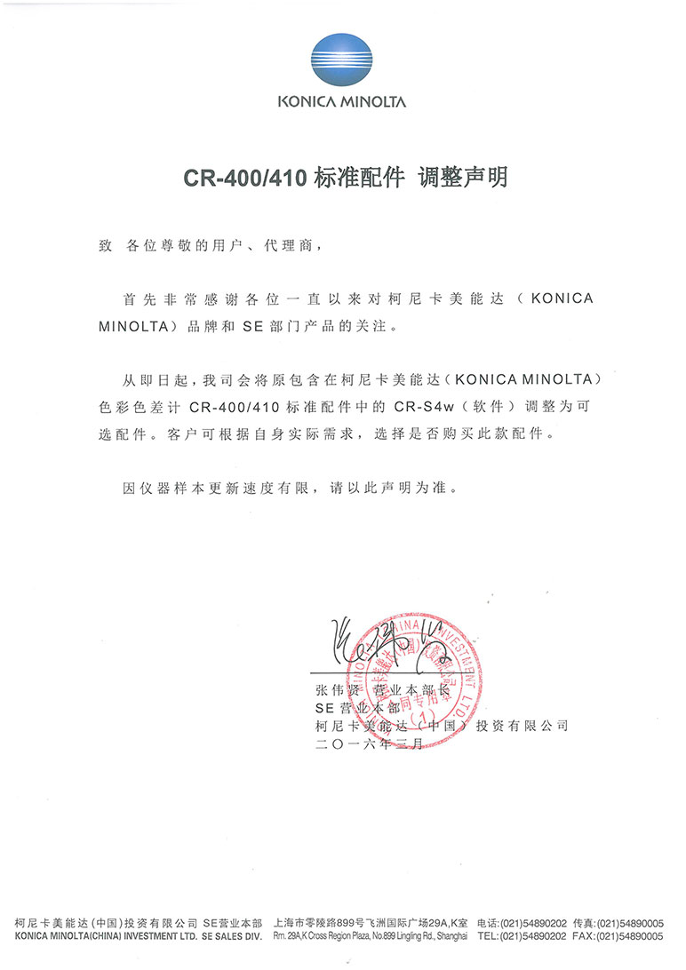 從即日起,我司會將原包含在柯尼卡美能達(KONICA MINOLTA)色彩色差計CR-400/410標準配件中的CR-S4w(軟件)調整為可選配件。客戶可根據自身實際需求,選擇是否購買此款配件。