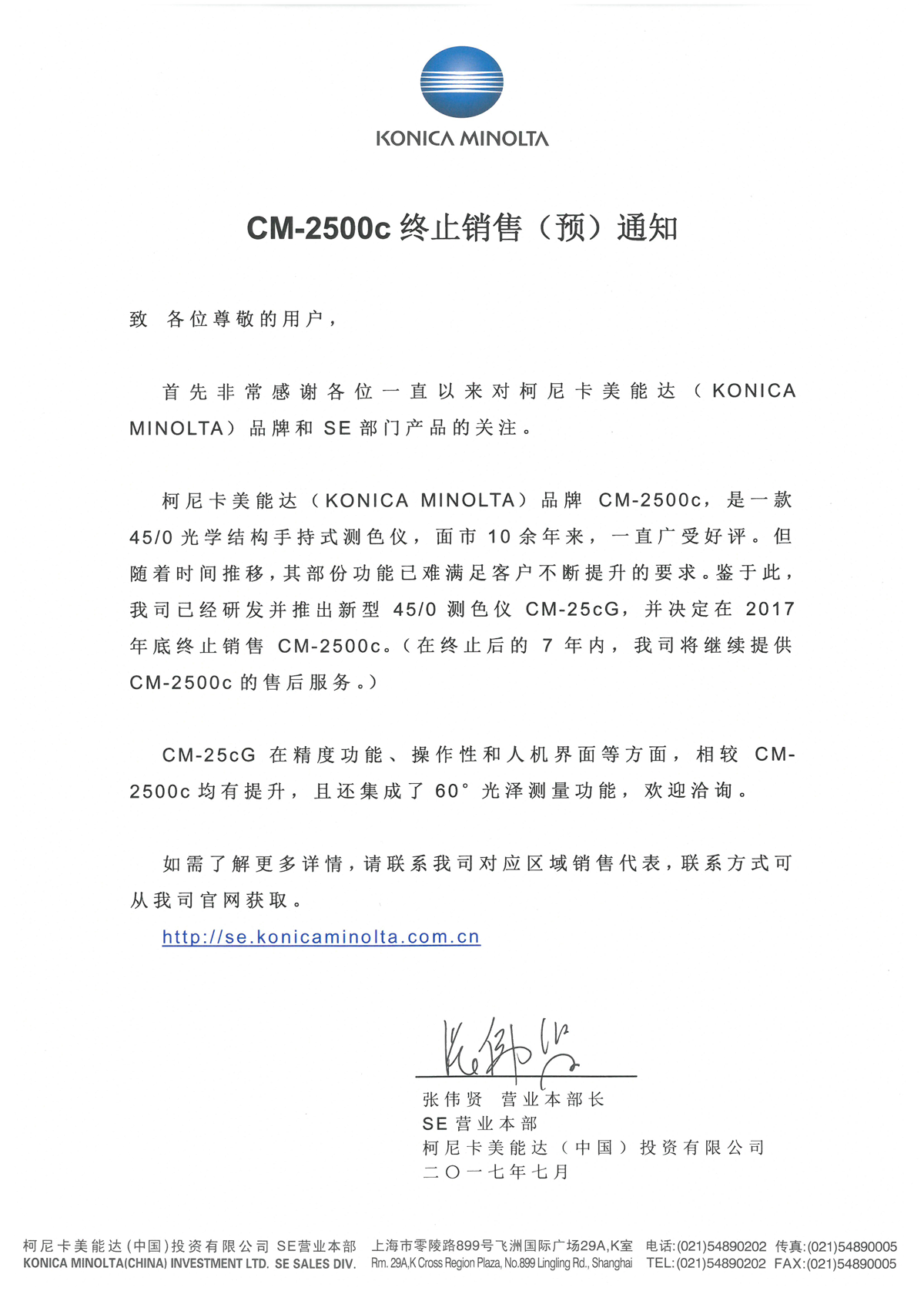 分光測色計CM-2500c將于2017年底正式終止銷售