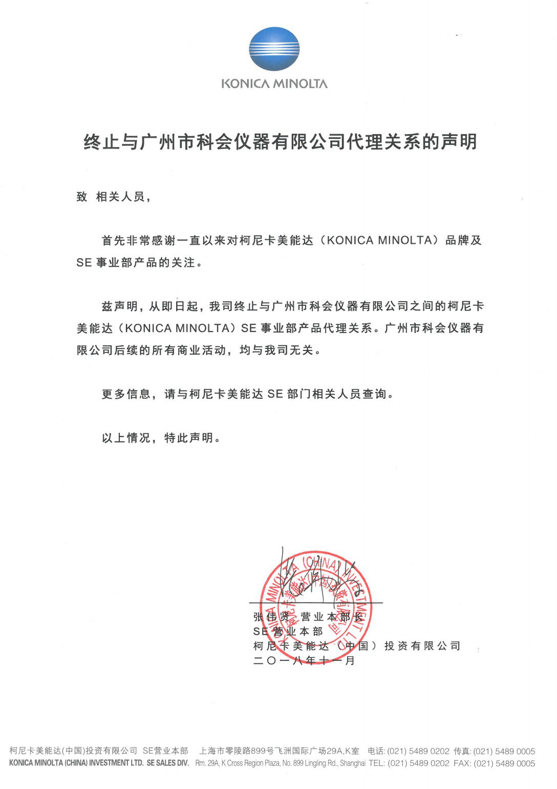 茲聲明,從即日起,我司終止與廣州市科會(huì)儀器有限公司之間的柯尼卡美能達(dá)(KONICA MINOLTA)SE事業(yè)部產(chǎn)品代理關(guān)系。廣州市科會(huì)儀器有限公司后續(xù)的所有商業(yè)活動(dòng),均與我司無(wú)關(guān)。