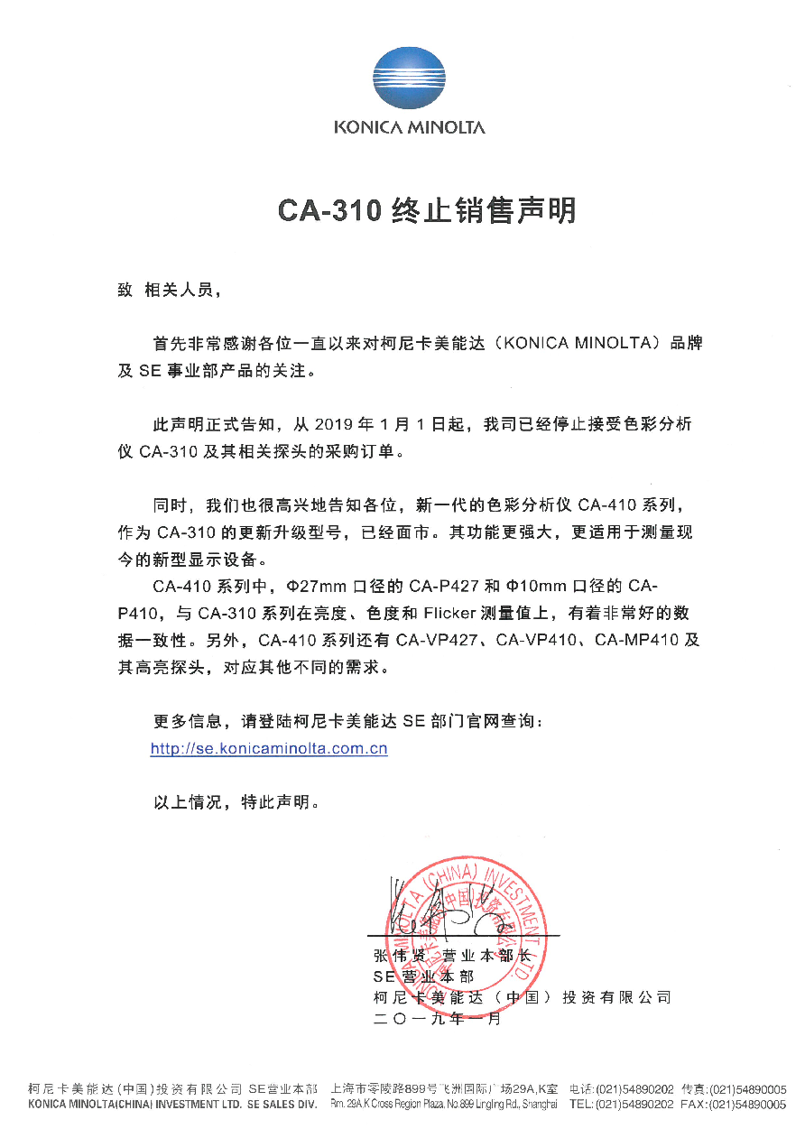 CA-310終止銷售聲明 2019年1月1日 此聲明正式告知,從2019年1月1日起,我司已經停止接受色彩分析儀CA-310及其相關探頭的采購訂單。 同時,我們也很高興地告知各位,新一代的色彩分析儀CA-410系列,作為CA-310的更新升級型號,已經面市。其功能更強大,更適用于測量現(xiàn)今的新型顯示設備。