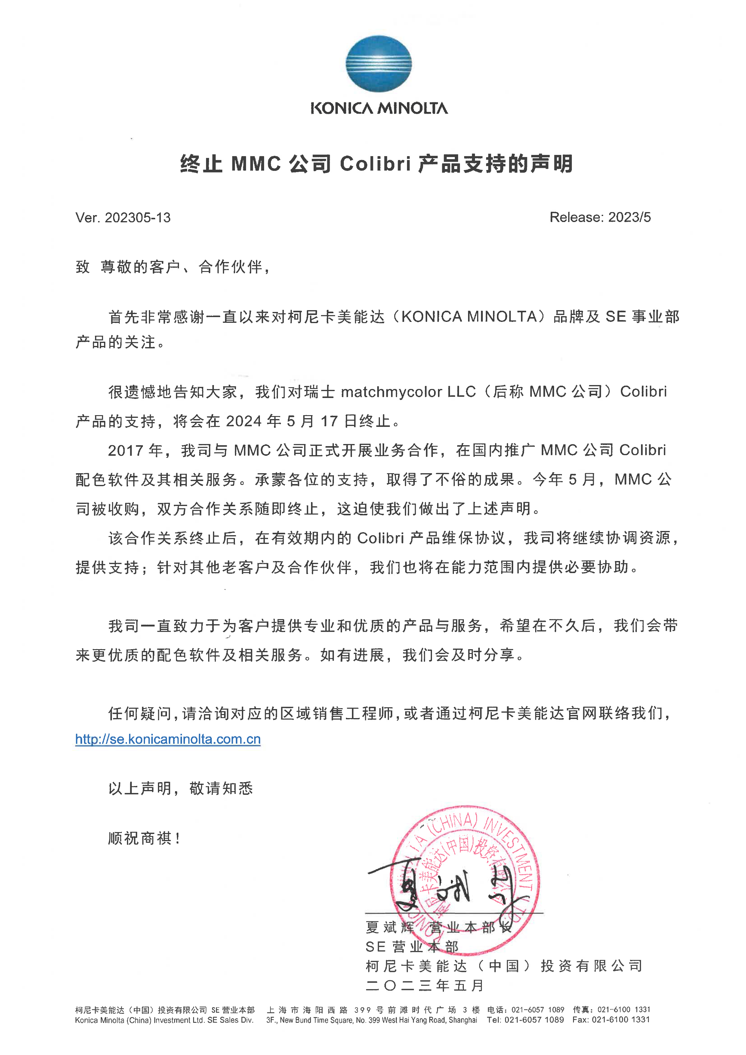 2017年,我司與MMC公司正式開展業務合作,在國內推廣MMC公司Colibri配色軟件及其相關服務。承蒙各位的支持,取得了不俗的成果。今年5月,MMC公司被收購,雙方合作關系隨即終止,這迫使我們做出了上述聲明。