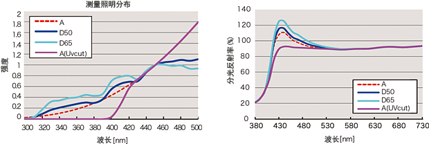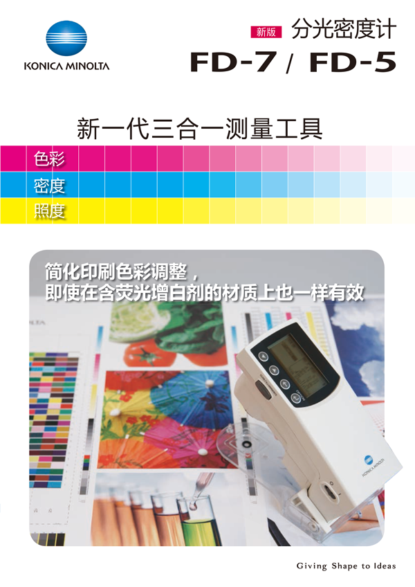 - FD-7和FD-5可以進行符合ISO 13655所有4種測量條件的測量。符合M1的測量可以通過柯尼卡美能達自創的VFS(虛擬熒光標準)技術實現,而符合M0(CIE光源A)和M2(帶UV截止濾光片的照明)的測量也可以實現。此外,通過安裝隨附的偏振光濾光片還可以進行符合M3(M2+偏振光濾光片)的測試。