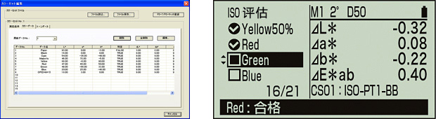 | 測量值 | 色度值、色差值、密度值、密度差、網點面積、網點增大、OK/NG判定、照度、相關色溫 | 色度值、色差值、密度值、密度差、網點面積、網點增大、OK/NG判定 |