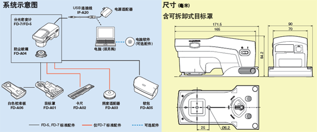 | 標準配件 | 白色校正板、目標罩、防塵玻璃、AC適配器(AC-USB轉換器)、USB電纜、軟盒、偏振光濾光片、適配器、FD數據傳輸軟件FD-S1w、照度附件(僅限FD-7)、標尺(僅限FD-7) | |