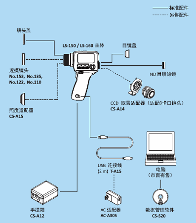 LS-150的1° 測量角可測量直徑小至14.4 mm的區域(距離為1,014 mm時);使用選配的近攝鏡頭時,可測量直徑小至1.3 mm的區域(距離為205 mm時)。LS-160的1/3° 測量角可測量直徑小至0.4 mm的區域(安裝近攝鏡頭110時)。