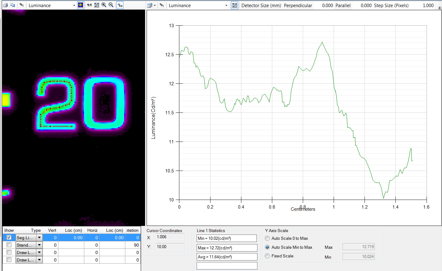 簡化的軟件操作及圖像分析功能每款Radiant ProMetric成像色度計都附帶了強大的ProMetric?軟件,基于軟件中的分段橫截面工具,可根據(jù)氛圍燈的形狀手動布線,從而得到該線上(即氛圍燈某一橫截面)的亮度、色度變化走勢圖,獲取清晰的圖像分析數(shù)據(jù)。 |