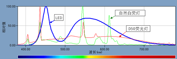 D50熒光燈、 自然白熒光燈和LED 的光譜分布相對(duì)強(qiáng)度